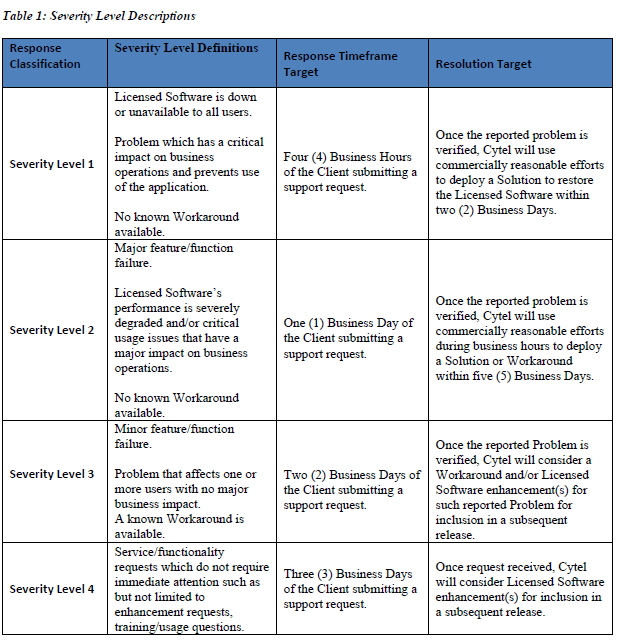 Severity: Defines the impact that a given Problem has on the Licensed Software and shall be determined in accordance with the table below. The severity level for a reported Problem is initially set by the person logging the issue and is confirmed during the triage process. Severity can be changed by the Cytel support team if it disagrees with the assigned severity level.